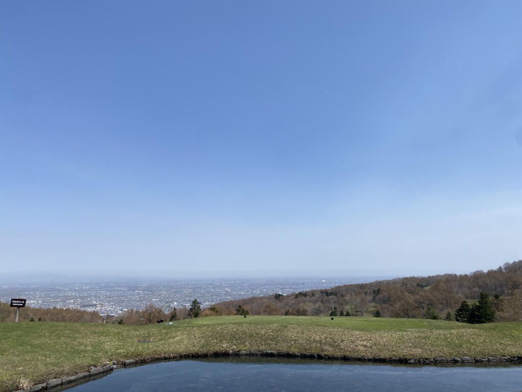 見てください、この鮮やかなグリーンの芝生!(写真3枚目・4枚目) 手稲山の斜面を活かしたコースからは、手稲区の街並みはもちろん、石狩湾まで見渡せるようなパノラマビューが楽しめます。