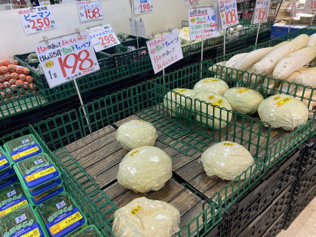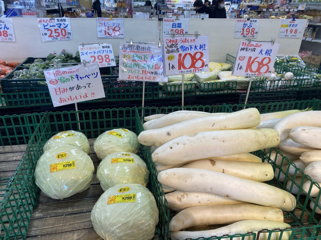 まず野菜コーナーで足を止めたのがこれ。 **「けんぶち産 雪下キャベツ(1玉198円)」と「函館亀田産 雪下大根(1本108円)」**です!