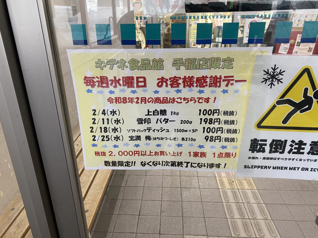 - 水曜日の衝撃: 入口の掲示板を見て震えました。2月11日(水)の感謝デーは、雪印バターが198円!?