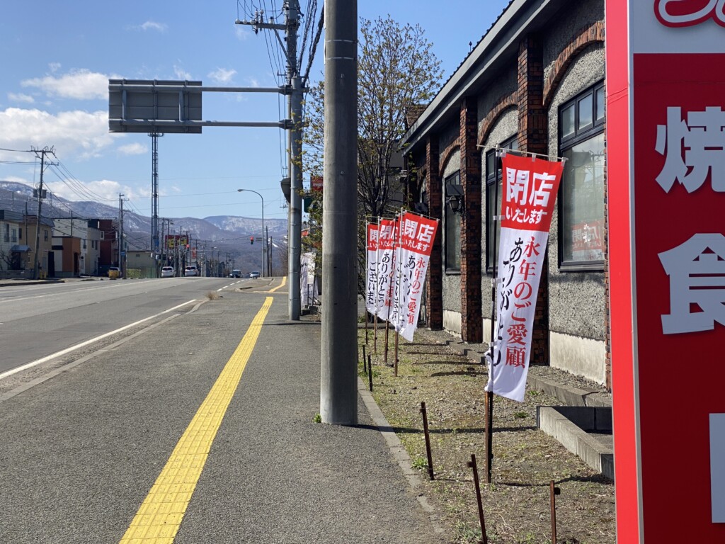 店先には「永年のご愛顧ありがとうございました」という赤い幟(のぼり)が並び、入り口には閉店を知らせる案内が掲示されています。