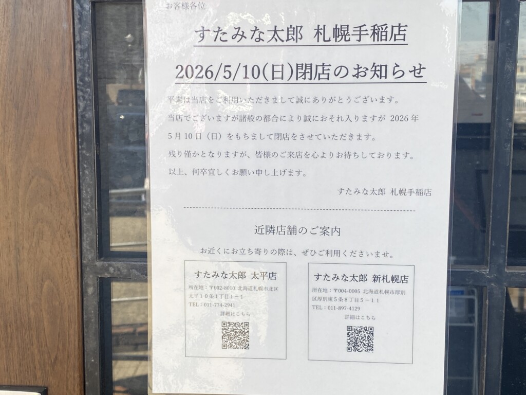 手稲店がなくなってしまうと、あの「すたみな太郎」の味が恋しくなった時は少し足を伸ばす必要がありそうです。掲示されていた近隣店舗はこちら。